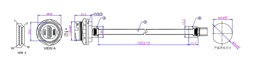E16 HDMIメスバックマウントからR/A HDMI男性FFCタイプ(銃剣)
