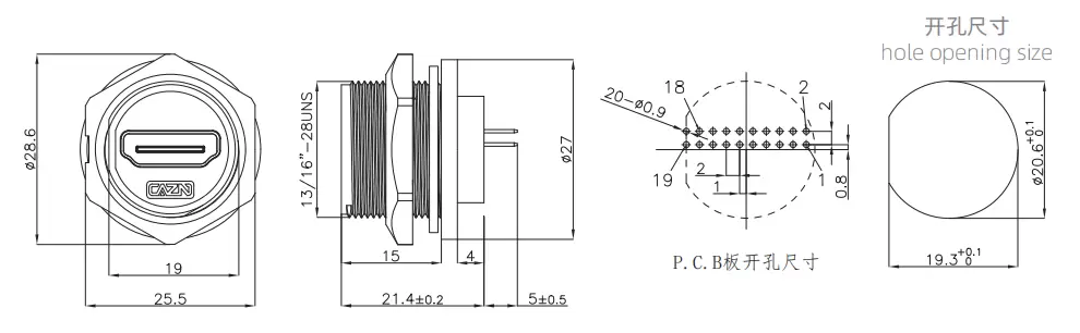 | HDMIメスバックマウントPCBレセプタクル(ねじれ) | HDMI 2K | E13T-FH2-PPF |