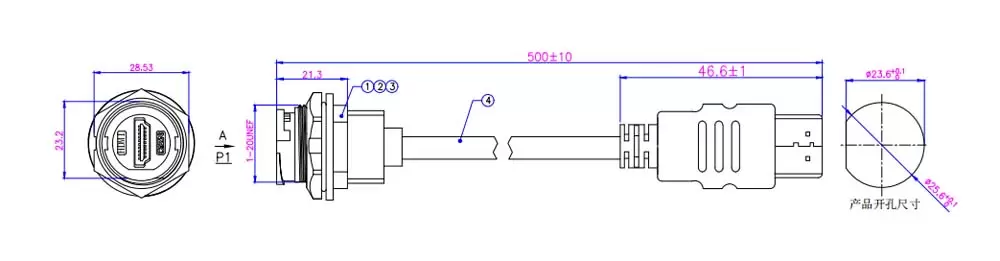 HDMIメスバックパネルマウントレセプタクルストレートオスケーブル (銃剣) | HDMI 4K | 1m | E16B -FH4-PWF/MH4-NWA-1PV-S | ||