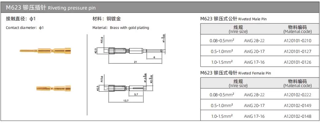| M623リベット付き男性ピン1mm | A120101-0127 | 0.5-1.0mm²AWG:20-17 | ||