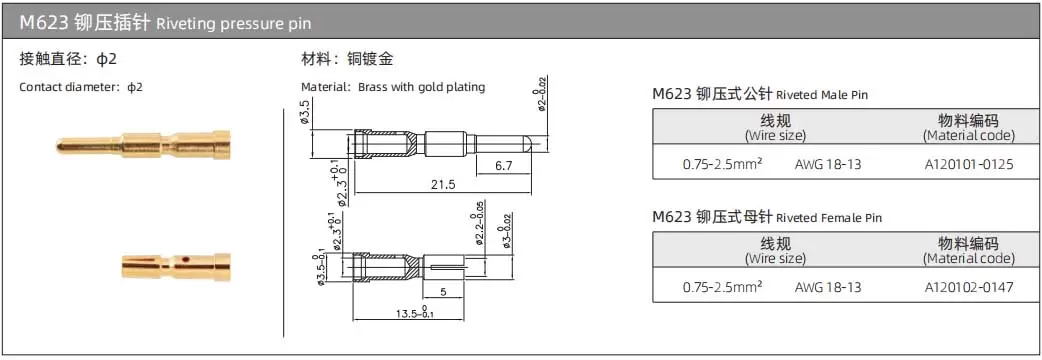 | M623リベット付き男性ピン2mm | A120101-0125 | 0.75-2.5mm²AWG:18-13 | ||