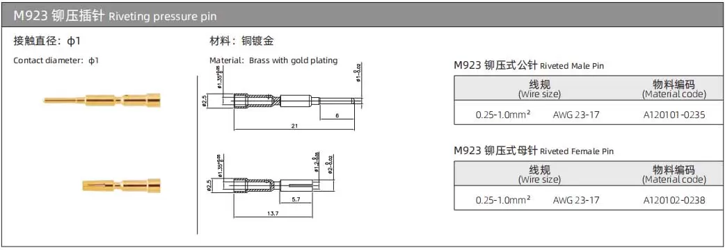 | M923リベット付き男性ピン1mm | A120101-0235 | 0.25-1.0mm²AWG:23-17 | ||