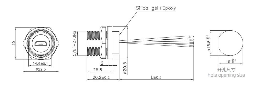 ワイヤー付きマイクロUSBメスバックマウントレセプタクル(銃剣)