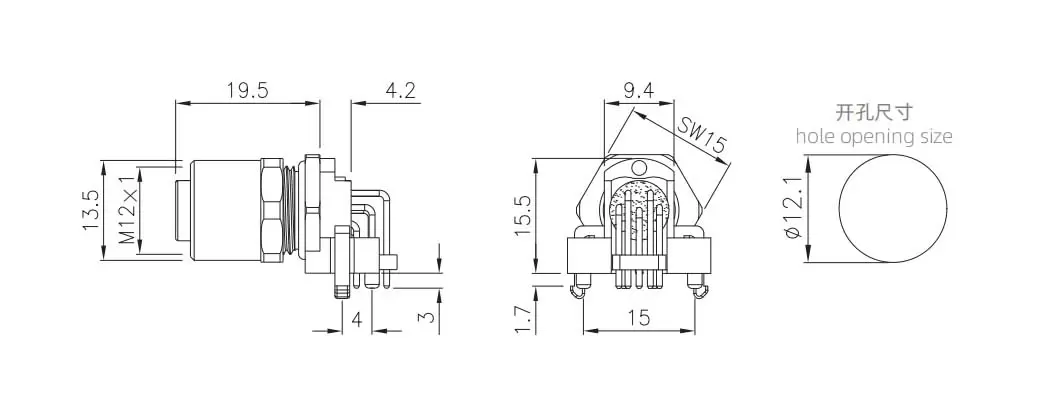 | M12湾曲した針ソケット(PCB、ネジM12*1) | M12-P12A- GPLM12 | M12-P12A- GPLM12 -JD | 12a | ||