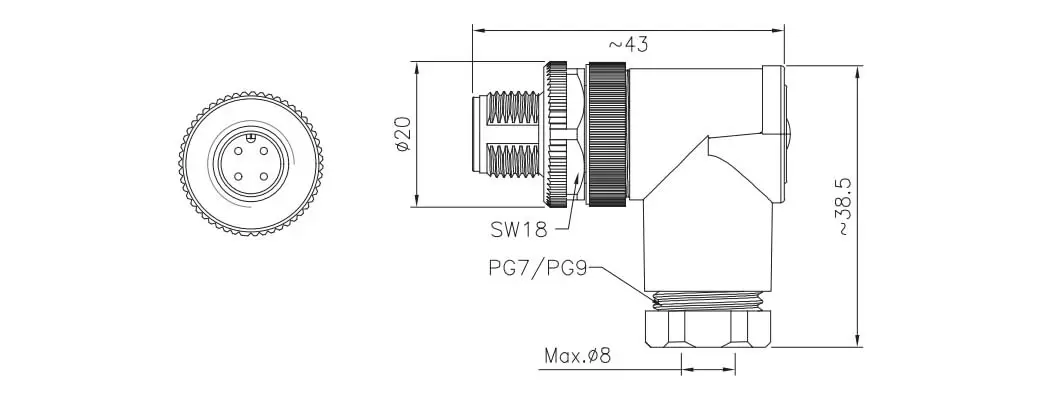 | 角度のある雄のプラスチック組み立てられたプラグ | M12-P8A-PLDP7 | M12-P8A-PLDP9 | 8a |