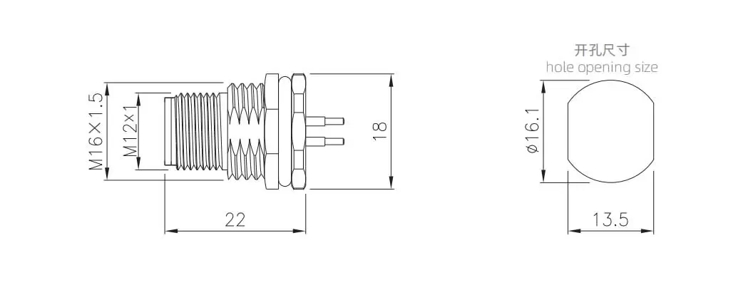 | M12男性バックマウントソケット(電源タイプ、はんだ、ネジM16*1.5) | M12-P2L-GPFM16-NP | M12-P2L-GPF PG9 -NP | 2L | ||