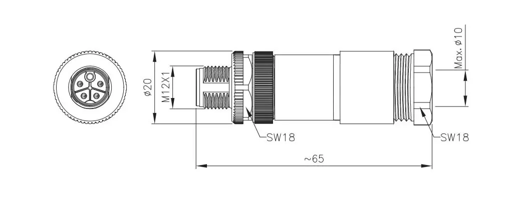 | M12ストレートオスのプラスチックアセンブルプラグ(パワータイプ、ネジ) | M12-P4K-PLAP11 | (3+PE)k | ||