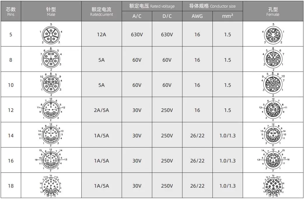 | M14女性フロントマウントソケット(はんだ)ネジM17x1.5 | M14-S18-GWBM17 | 18ピン |