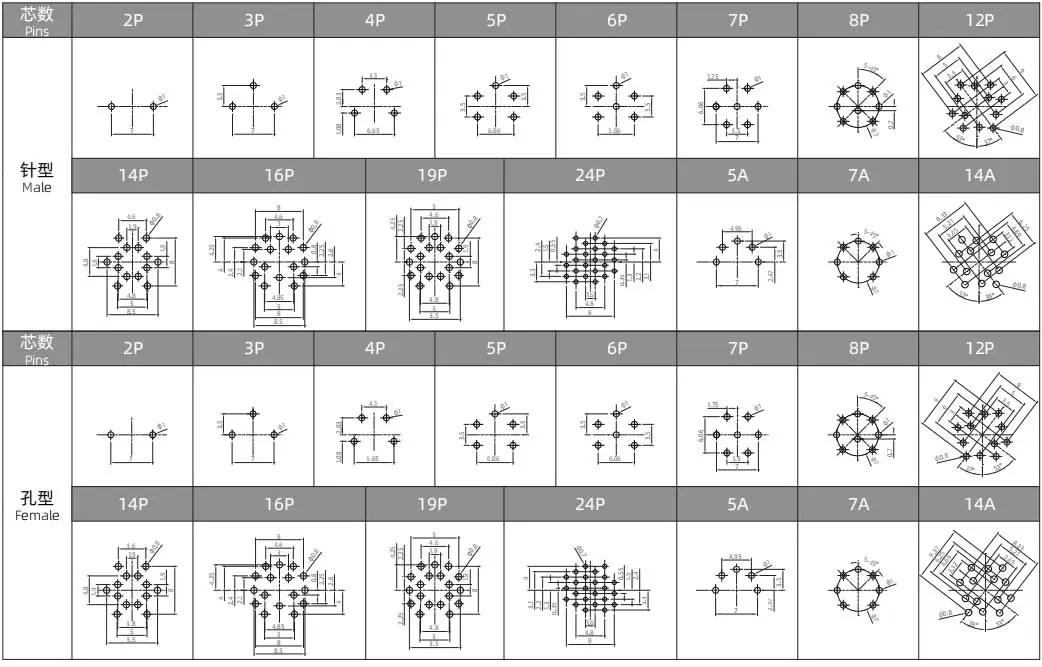 | M16男性フロントマウントソケット(PCB) | M16-P14A-GPBM18 | 14ピンAコード | ||