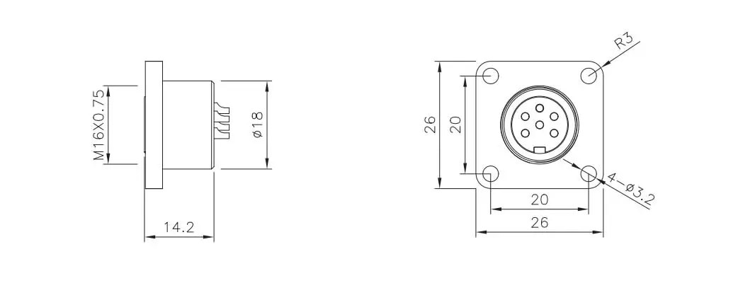 | M16雌四角ソケット(はんだ)穴20*20 | M16-S2-GWH | 2ピン | ||