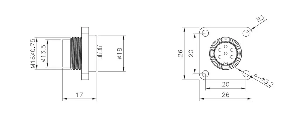 | M16オス スクエアソケット(はんだ)穴20*20 | M16-P3- GWH | 3ピン | ||