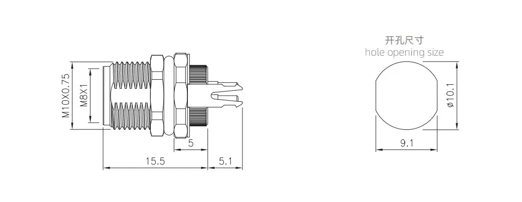 | M8メスバックマウントソケット(PCB、ネジM10*0.75、接地タイプ) | M8-S5B-GPFM10-JD | 5ピンBコード | ||