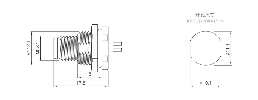 | M8男性バックマウントソケット(PCB、ネジM11*1) | M8-P3A-GPFM11 | 3ピンAコード | ||