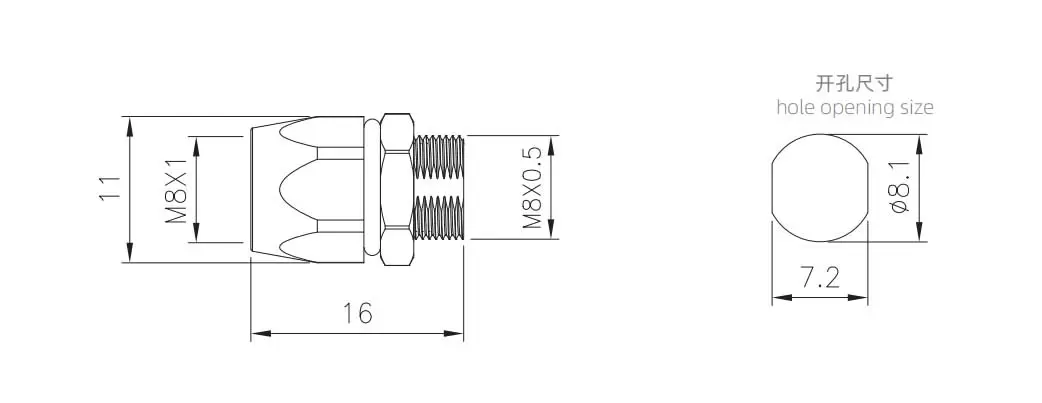 | M8メスフロントマウントソケット(はんだ、ネジM8*0.5、弾丸タイプ) | M8-S8A-GWBM8-ZD | 8 ピンAコード |