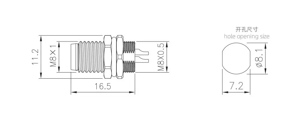 M8オスフロントマウントソケット(PCB、ネジM8*0.5、金属インターフェイス)