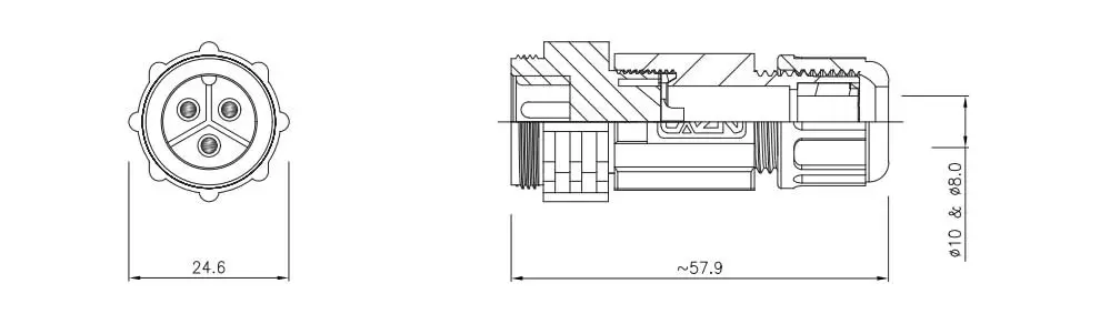 | E13ストレート オス アセンブリプラグ(スレッド) | 300V | 20a | E13T-P3B- PWK08 | 3b | ||