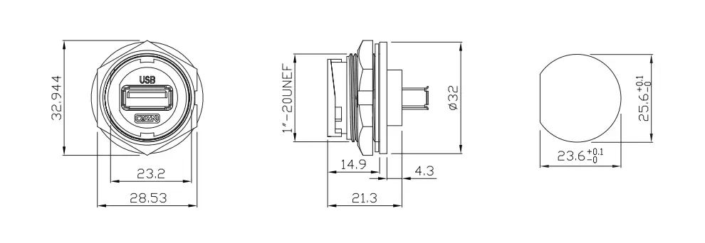 E16 USB女性バックマウントレセプタクル付きワイヤー(銃剣)
