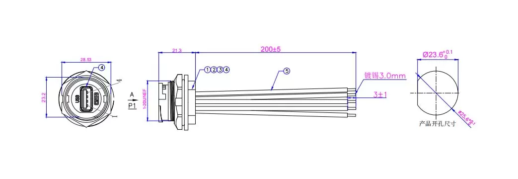 | E16 USB女性バックマウントレセプタクル付きワイヤー(銃剣) | USB 2.0 | E16B-FU2-PWF-0.2PV | ||